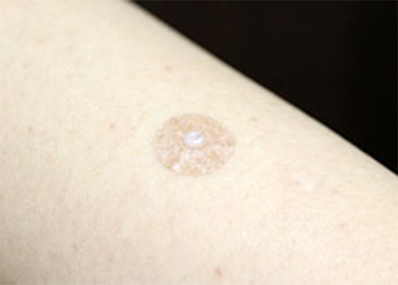 円皮鍼の形状は、小型の画ビョウに円形のテープを張り付けたような形をしています。テープ自体が肌と同じような色をしているため使用してもあまり目立ちません。また鍼本体が微細なため、使用されても痛みや違和感を感じられる方はほとんどおられません。むしろ挿入感が薄いため円皮鍼を装着しているのを忘れることが多く、注意が必要なほどです。 本体にテープが付いているため、身体の中に「鍼」が勝手に入ることはありません。