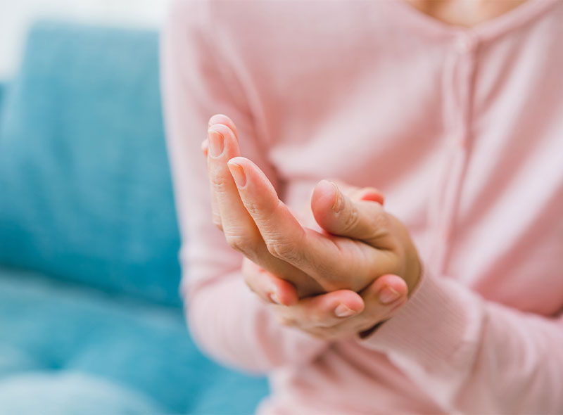 手を振ったり、指を曲げ伸ばししたりするとしびれ、痛みは楽になります。手のこわばり感が出ることもあります。ひどくなると母指の付け根の筋肉がやせて人差し指と親指できれいな丸(OKサイン)ができなくなります。また細かいものがつまめなくなります。